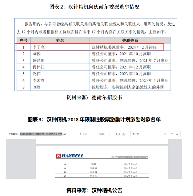 值得注意的是,汉钟精机与德耐尔的关系颇为密切。根据招股书的披露,德耐尔的董事张启华同时也在汉钟精机担任空压机事业部协理。2024年2月前,汉钟精机还曾委派李子亮到德耐尔担任董事。根据汉钟精机发布的《2018年限制性股票激励计划激励对象名单》,彼时李子亮为汉钟精机的核心骨干人员。