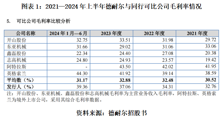在这一模式下,或由于德耐尔承担生产的成本压力较小,其毛利率表现优于4家同行可比公司。根据招股书,如图表1所示,2021—2024年上半年,德耐尔的毛利率均高于同行可比公司的均值,在7家国内外同行可比公司中排名前三,在5家国内同行可比公司中排名第一。