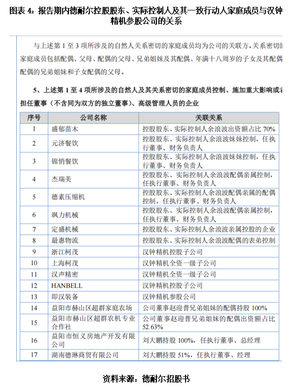 此外,如图表4所示,德耐尔的控股股东、实际控制人及其一致行动人的家庭成员控制、施加重大影响或者担任董事(不含同为双方的独立董事)、高级管理人员的企业中,有5家是汉钟精机的控股、参股公司。