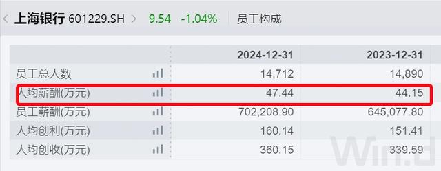 截至2024年末,上海银行职工总数1.47万人,人均税前薪酬47.4万元,比浦发银行当年人均税前薪酬(42.3万元)要多5万元。