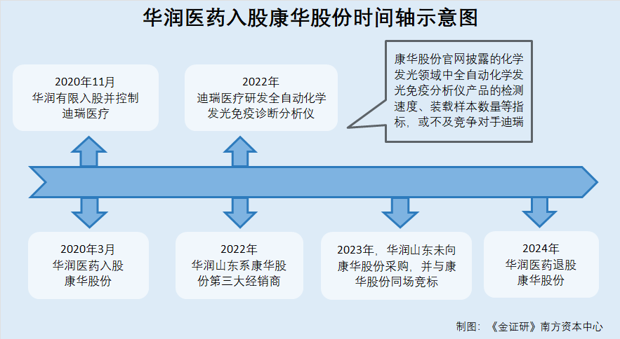 总而言之,华润有限于2020年取得迪瑞医疗的控制权,并在当年通过华润医药入股康华股份。在此背景下,康华股份官网披露的化学发光领域中全自动化学发光免疫分析仪产品的检测速度、装载样本数量等指标,或不及竞争对手迪瑞医疗2022年研发的产品。次年即2023年,华润有限旗下的华润山东,自康华股份前五大经销商名单中“离席”,并于同年和康华股份同场竞标。2024年9月,华润医药将所持有的康华股份的全部股权,转让给康华股份的实控人并退出康华股份。