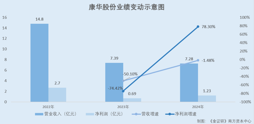 据康华股份签署日为2025年5月15日的招股说明书(以下简称“2025年5月15日招股书”),2022-2024年,康华股份的营业收入分别为14.8亿元、7.39亿元、7.28亿元;2023-2024年康华股份的营收增速分别为-50.1%、-1.48%。