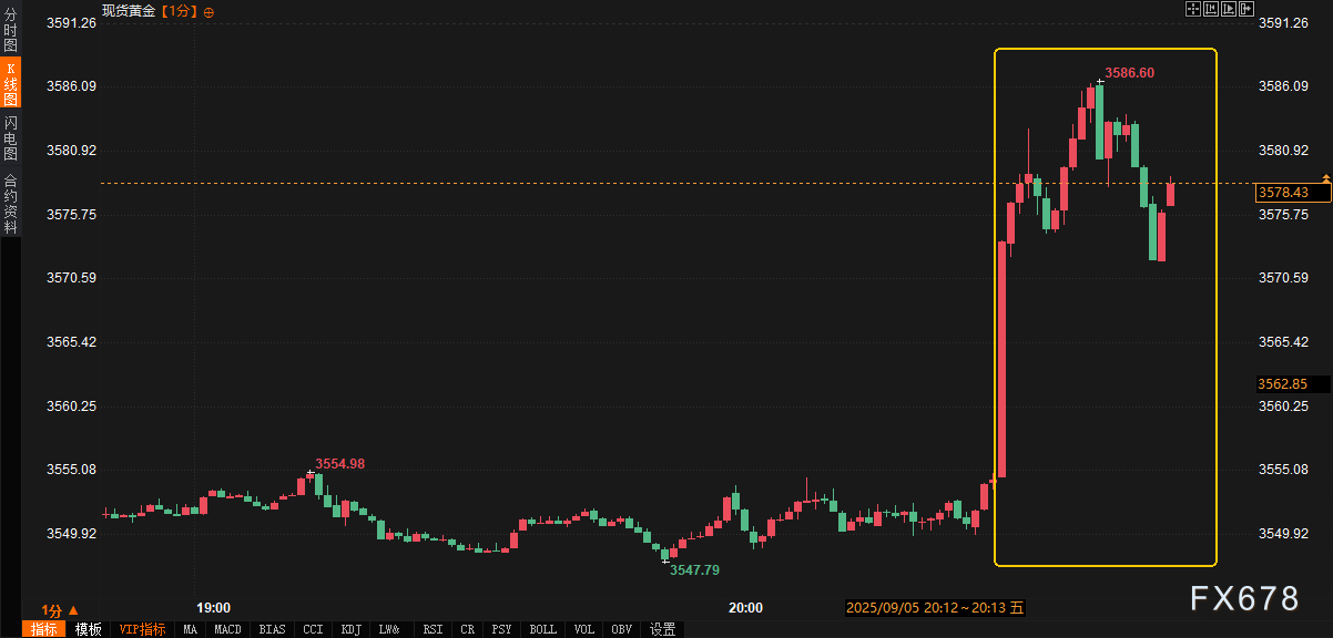 非农数据公布后,金融市场迅速做出反应,美元指数短线急跌至97.57,日内跌幅扩大至0.73%,创四日新低。美债收益率同样承压,10年期美债收益率下跌6.7个基点至4.109%,2年期收益率下跌6.2个基点至3.529%,2/10年期收益率曲线陡化至60.4个基点,反映市场对短期利率下调的强烈预期。 与此同时,避险资产和风险资产均出现显著上涨。现货黄金突破3580美元/盎司关口,创历史新高3582.77美元/盎司,日内涨幅达1.02%;现货白银突破41美元/盎司,报41.09美元/盎司,涨幅1.10%。美股期货也受到提振,纳斯达克100指数期货盘前涨幅扩大,标普500指数期货收窄跌幅,显示投资者风险偏好有所回升。