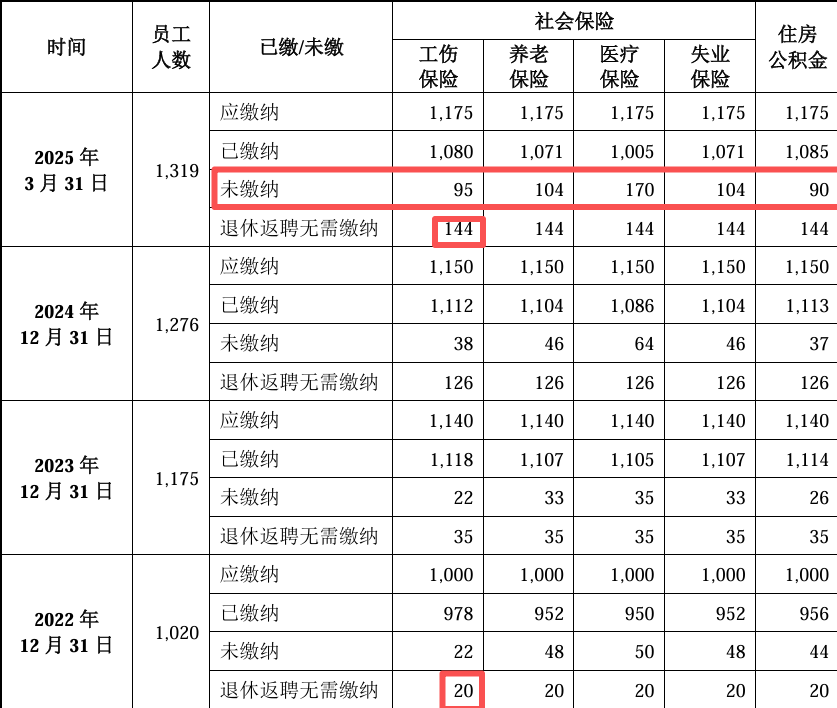 招股书显示,截至2025年3月末,公司共有员工1319人,但社保和公积金缴纳存在明显缺口:95人未缴工伤保险、104人未缴养老保险、170人未缴医疗保险、104人未缴失业保险,另有90人未缴住房公积金。