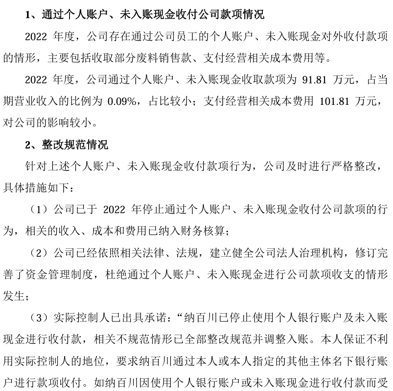 此外,2022年公司仍存在通过员工个人账户收取废料销售款、支付经营费用的情况,金额超过190万元。