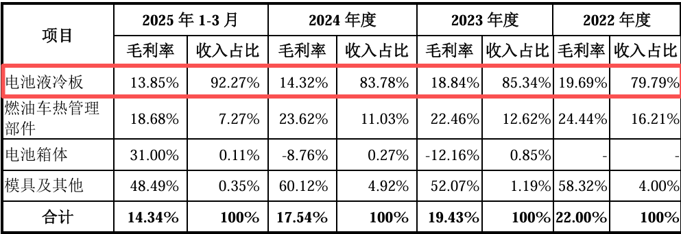 作为主营产品的电池液冷板,其毛利率在三年间从19.69%跌至13.85%,再继续跌至今年一季度的13.85%,几乎失去了盈利弹性。