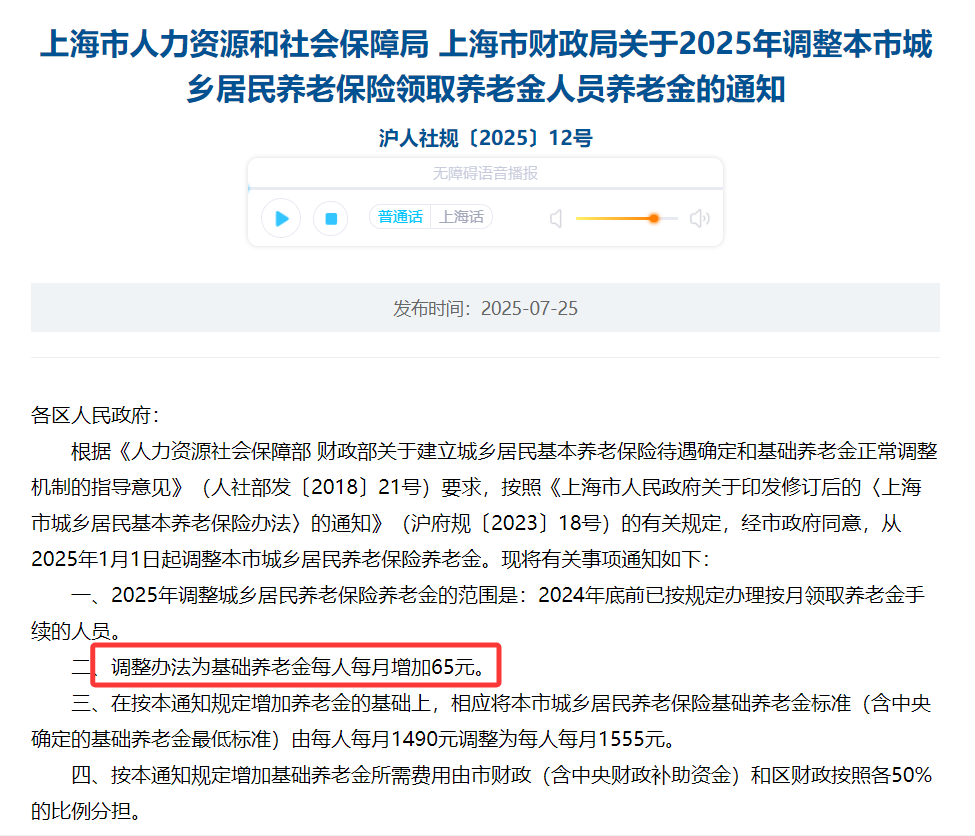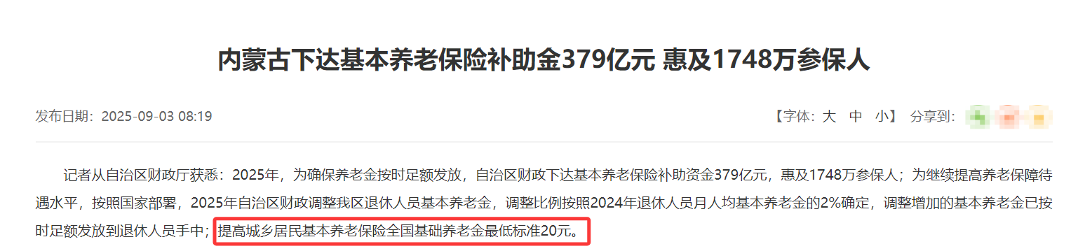 内蒙古发了一个消息,说按照国家部署,2025年自治区财政调整我区退休人员基本养老金,调整增加的基本养老金已经发放到位,另外,提高城乡居民基本养老保险全国基础养老金最低标准20元。