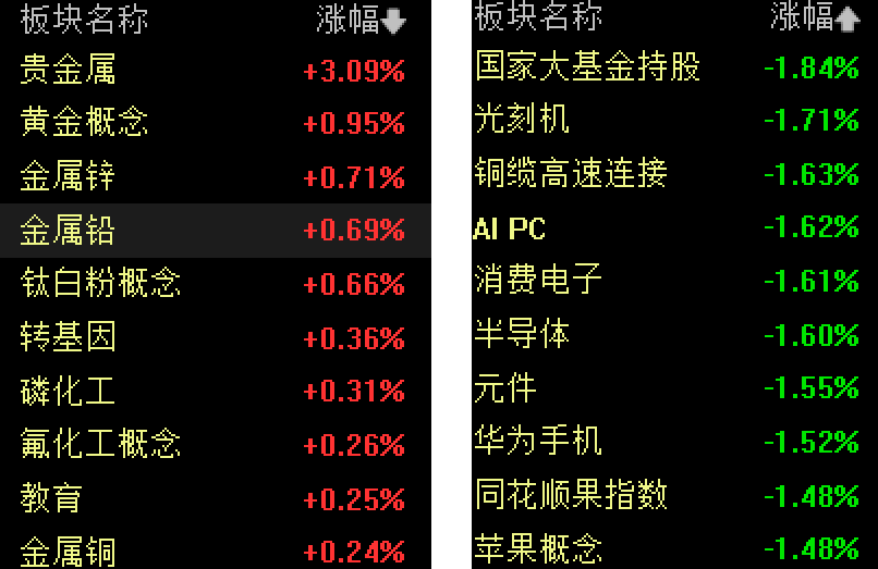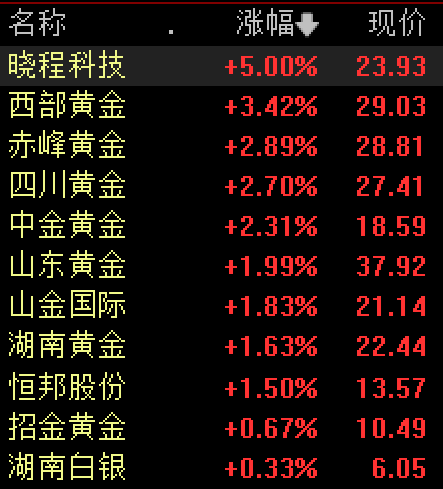 黄金概念板块领涨,其中晓程科技上涨5%,西部黄金涨超3%,四川黄金、中金黄金等跟涨。