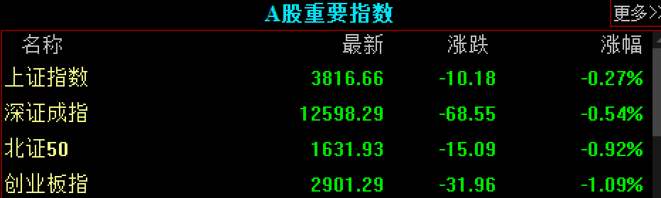 三大股指集体低开,上证指数开盘报3816.66点,跌0.27%,深成指开盘报12598.29点,跌0.54%,创业板指开盘报2901.29点,跌1.09%。黄金、贵金属、房地产板块活跃,电池、半导体概念低开。