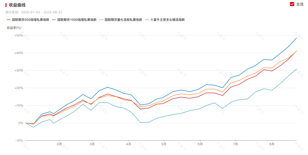 截至 8 月 22日,国联期货1000 指增收益 41.13%,500 指增收益 48.48%,空气指增收益40.99%,与之相比,火富牛主观多头精选指数即便拿下30.72% 的高收益,还是有些相形见绌。