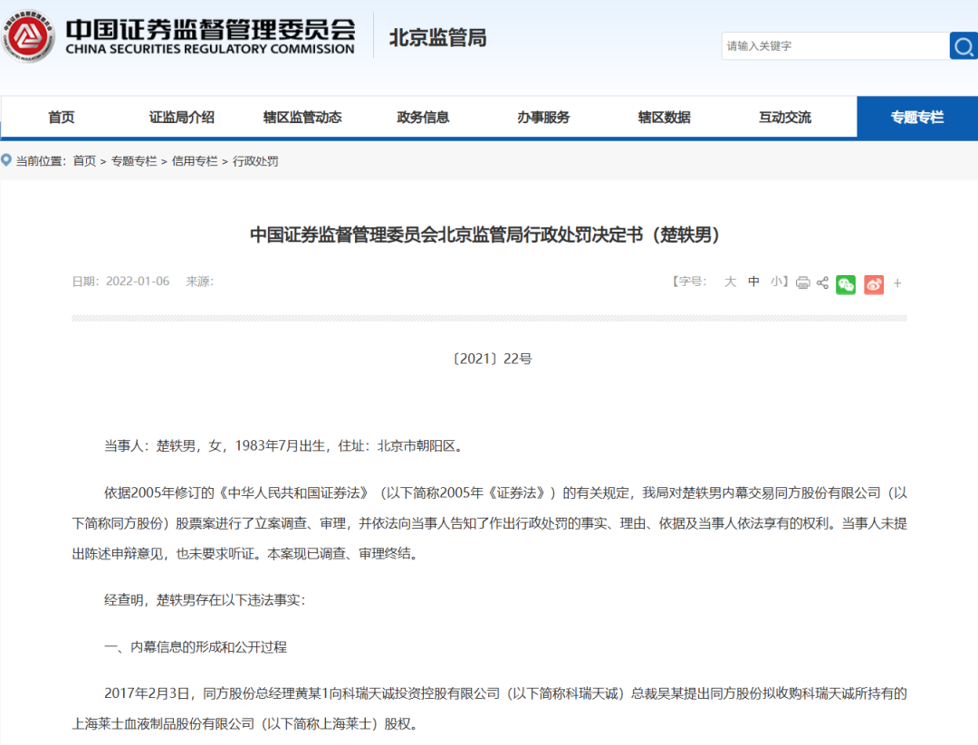 2021年底,北京证监局对楚轶男作出行政处罚,处以40万元罚款。