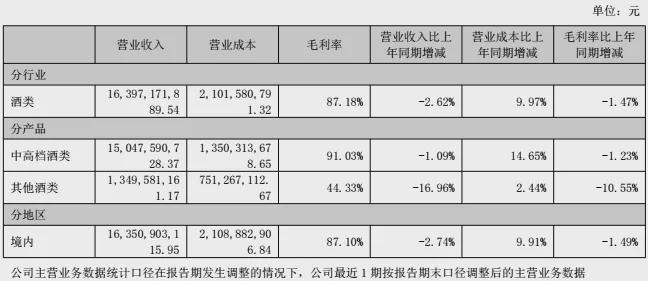 看泸州老窖产品结构,上半年中高档酒、其他酒、其他收入分别贡献营收150.48亿元、13.5亿元、0.57亿元,均同比下滑1.09%、16.96%、14.68%。换言之,泸州老窖旗下中高档酒营收占上半年总营收的91.45%,毛利率91.03%,但同比均遭微跌,直接导致中报业绩双降。