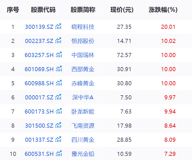 9月9日,A股黄金概念板块大涨。截至收盘,晓程科技(300139.SZ)、恒邦股份(002237.SZ)、中国瑞林(603257.SH)、西部黄金(601069.SH)、赤峰黄金(600988.SH)等多股涨停,飞南资源(301500.SZ)、四川黄金(001337.SZ)、豫光金铅(600531.SH)涨超7%。