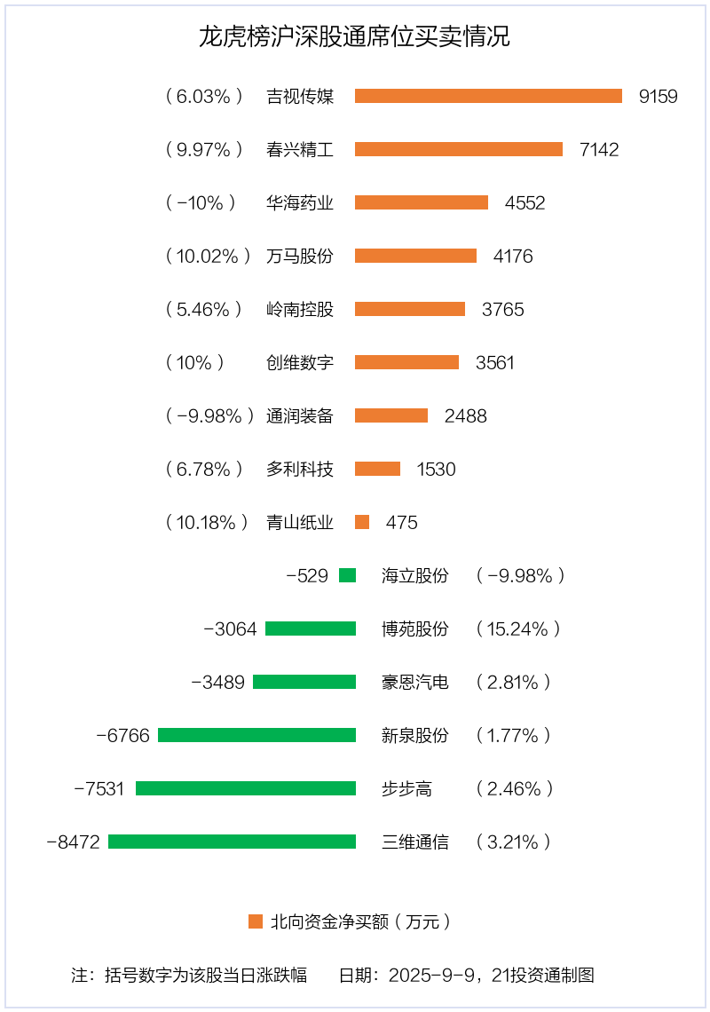 9月9日,北向资金参与龙虎榜中的个股共有15只,合计净买入6996.43万元。其中沪股通净买入3 股,净卖出2 股,合计净买入6891.11万元;深股通净买入6 股,净卖出4 股,合计净买入105.32万元。