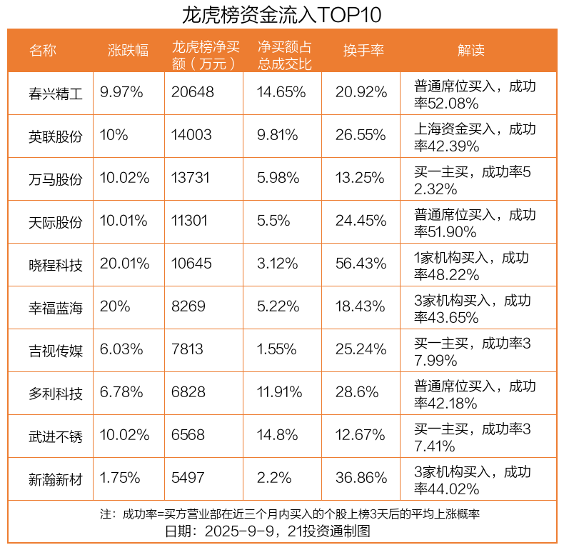 9月9日,上证指数下跌0.51%,深证成指下跌1.23%,创业板指下跌2.23%。盘后龙虎榜数据显示,共有43只个股因当日异动登上龙虎榜,资金净流入最多的是春兴精工(002547.SZ),达2.06亿元。