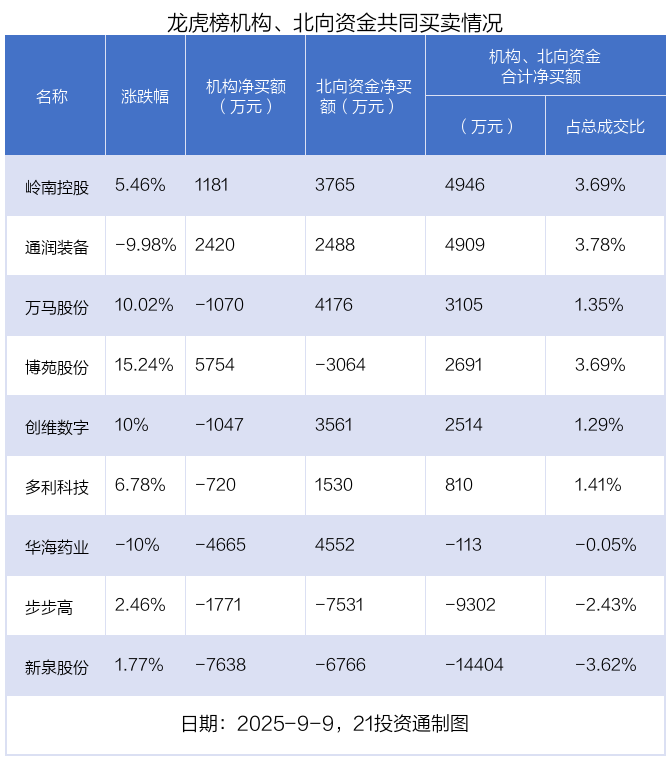 值得注意的是,机构和北向资金共同净买入了岭南控股、通润装备等2股;共同净卖出了新泉股份、步步高等2股;在华海药业,万马股份,创维数字,多利科技,博苑股份上出现分歧,机构净卖出华海药业4665.26万元,北向资金净买入4551.87万元;机构净卖出万马股份1070.39万元,北向资金净买入4175.61万元;机构净卖出创维数字1047.24万元,北向资金净买入3560.89万元;机构净卖出多利科技719.98万元,北向资金净买入1529.95万元;机构净买入博苑股份5754.35万元,北向资金净卖出3063.74万元。