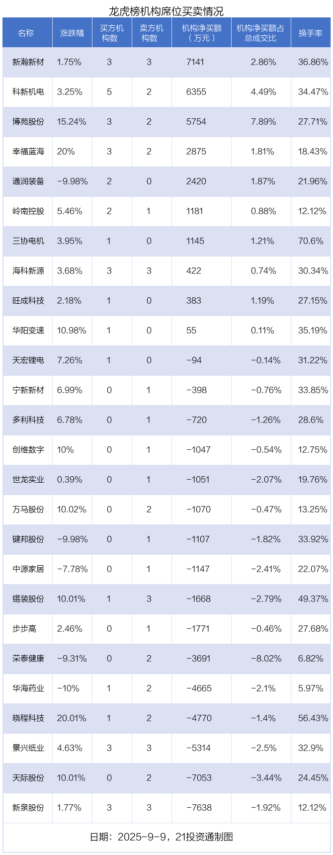 其中,机构净买入金额最多的是新瀚新材(301076.SZ),当日收盘上涨1.75%,换手率为36.86%。