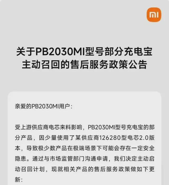 8月29日,认证为小米公司的微博@小米服务 发布公告称,召回存在安全隐患的充电宝(型号:PB2030MI)14.6万余台。