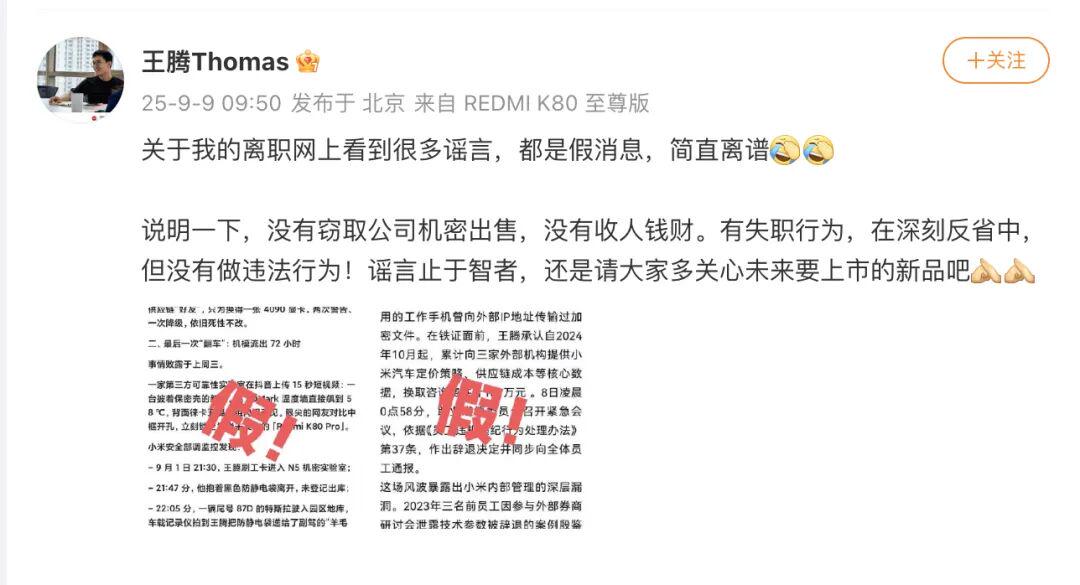 对于王腾被辞退的原因,网络传言称,是因为王腾累计向三家外部机构提供小米汽车定价策略、供应链成本等核心数据,换取187万元咨询费。9月9日上午,王腾再度发微博回应:“都是假消息”,没有窃取公司机密出售,没有收人钱财,有失职行为,但没有做违法行为。