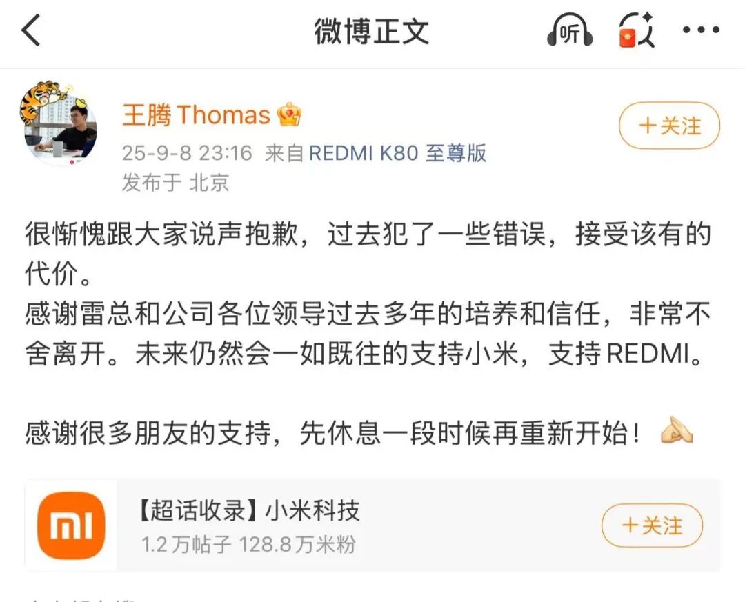9月8日深夜,小米中国区市场部原总经理、REDMI品牌原总经理、REDMI品牌原发言人王腾发微博表示:“很惭愧跟大家说声抱歉,过去犯了一些错误,接受该有的代价。感谢雷总和公司各位领导过去多年的培养和信任,非常不舍离开。未来仍然会一如既往的支持小米,支持REDMI。”