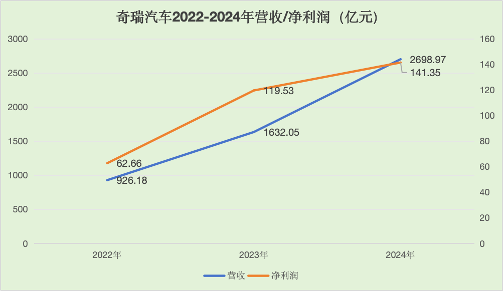 2024年,奇瑞汽车营收2698.97亿元,同比增长65.4%;净利润143.34亿元,同比增长37.2%。无论是营收规模还是业绩增速,均居国内自主品牌车企前列。