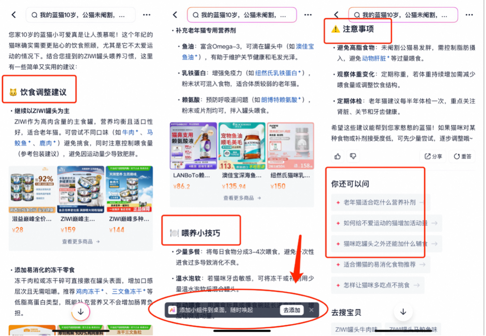 在饮食调整建议上,它仍然推荐了我使用过的ZIWI罐头,还根据我的购物偏好推荐了澳佳宝品牌。除了推荐产品以外,喂养小技巧和注意事项在宠物喂养知识上给到了支持,“你还可以问”这个板块也非常适用。