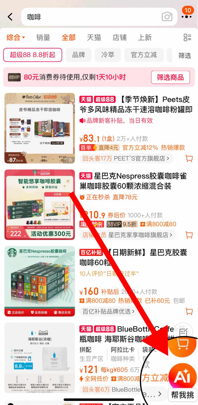 与此同时,AI助手在商品信息流中也内置了卡片式的入口。我输入的品类搜索词是咖啡,它自动生成了3个关于口味偏好的问题:想要什么风格?对咖啡的温度偏好以及咖啡的余味如何。