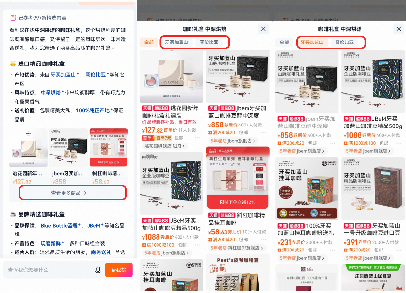 经典传统风格上,它区分了意式和美式,再次划出了漂亮的分水岭,并且提示我区分礼物目标人群的偏好和需求。点击“查看更多商品”,在浏览商品信息流的同时也能根据AI提供的标签快速筛选。