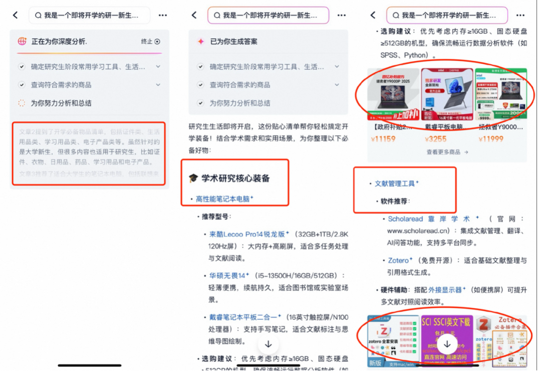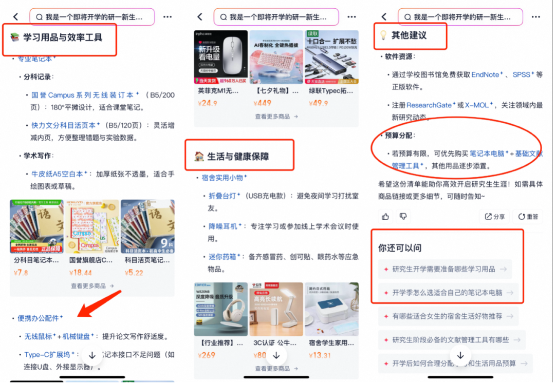 prompt2为:我是一个即将开学的研一新生,请问我需要买点什么?由于问题相对抽象,我打开【深度思考】,关掉【购物偏好】。