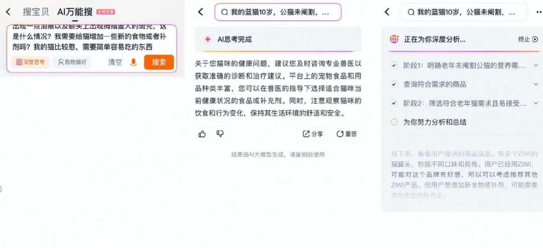 此前,在8月中旬淘宝还低调上线了另一款AI问答产品“AI万能搜”,和AI助手更聚焦于“商品筛选”不同的是,AI万能搜更像是一款淘宝内置的生活消费版“DeepSeek”类大模型产品,它不仅有思维链的功能,还可以提供商品之外的多模态的内容类信息。