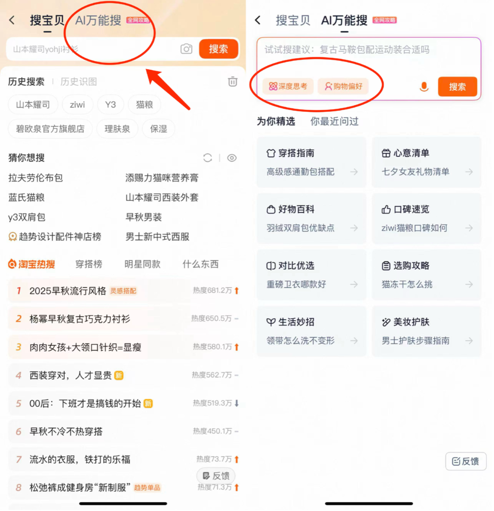 打开页面,点击搜索框,在传统功能“搜宝贝”的隔壁,就是最新的“AI 万能搜”。轻轻左滑触达 AI 模式。