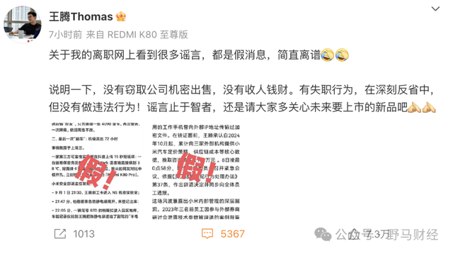 王腾随后在社交平台发文回应:“很惭愧跟大家说声抱歉,过去犯了一些错误,接受该有的代价。”并在9月9日再次发微博辟谣了市场上一些关于其“窃取公司机密出售,收人钱财”的传言,表示“有失职行为,在深刻反省中,但没有做违法行为!”甚至在辟谣最后再次为小米未来要上市的新品进行宣传。