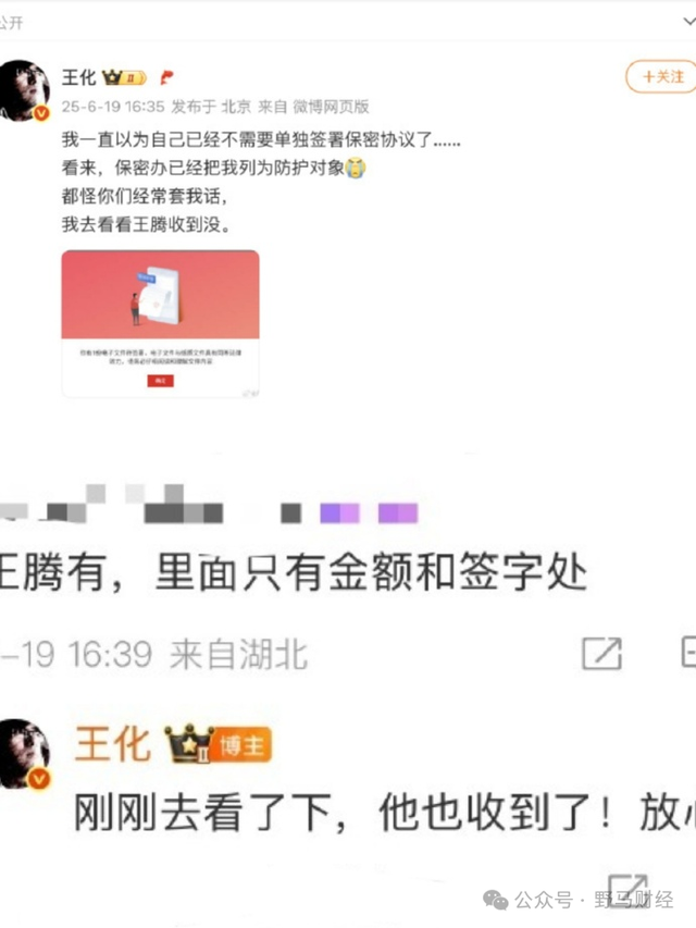 2025年6月,王化发文称,自己和王腾都被保密办列为“防护对象”,需要单独签署保密协议。后来王化在评论区表示“刚刚去看了下,他(王腾)也收到了!放心了!”