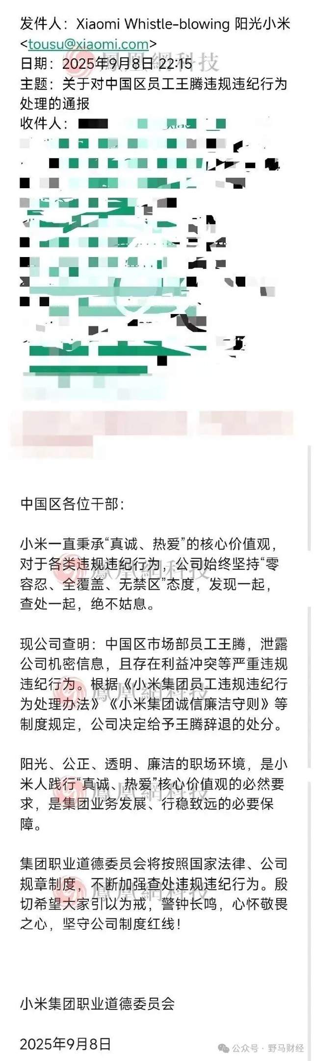 9月8日晚,小米集团职业道德委员会的一则内部通报邮件显示,中国区市场部员工王腾因“泄露公司机密信息,且存在利益冲突等严重违规违纪行为”被公司辞退。