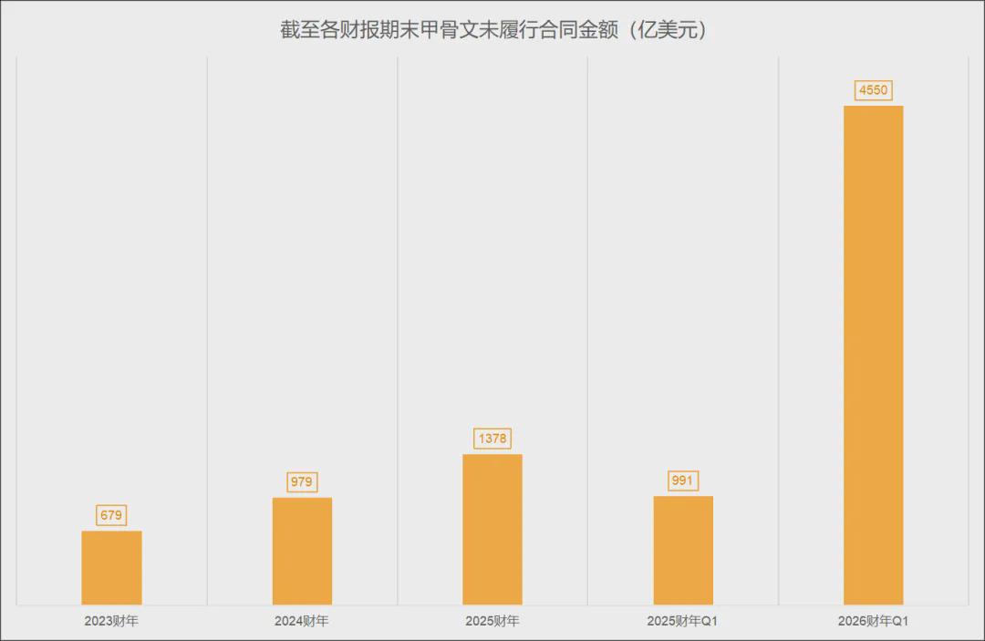 但事实上,这次暴涨并非业绩有多超预期,其营收和每股收益(EPS)都没有达到华尔街分析师的期望,自由现金流甚至还是负的。真正让投资者们疯狂的,是高达4550亿美元、同比增长360%的未履约合同金额,以及这个数字仍将持续上升的预期。
