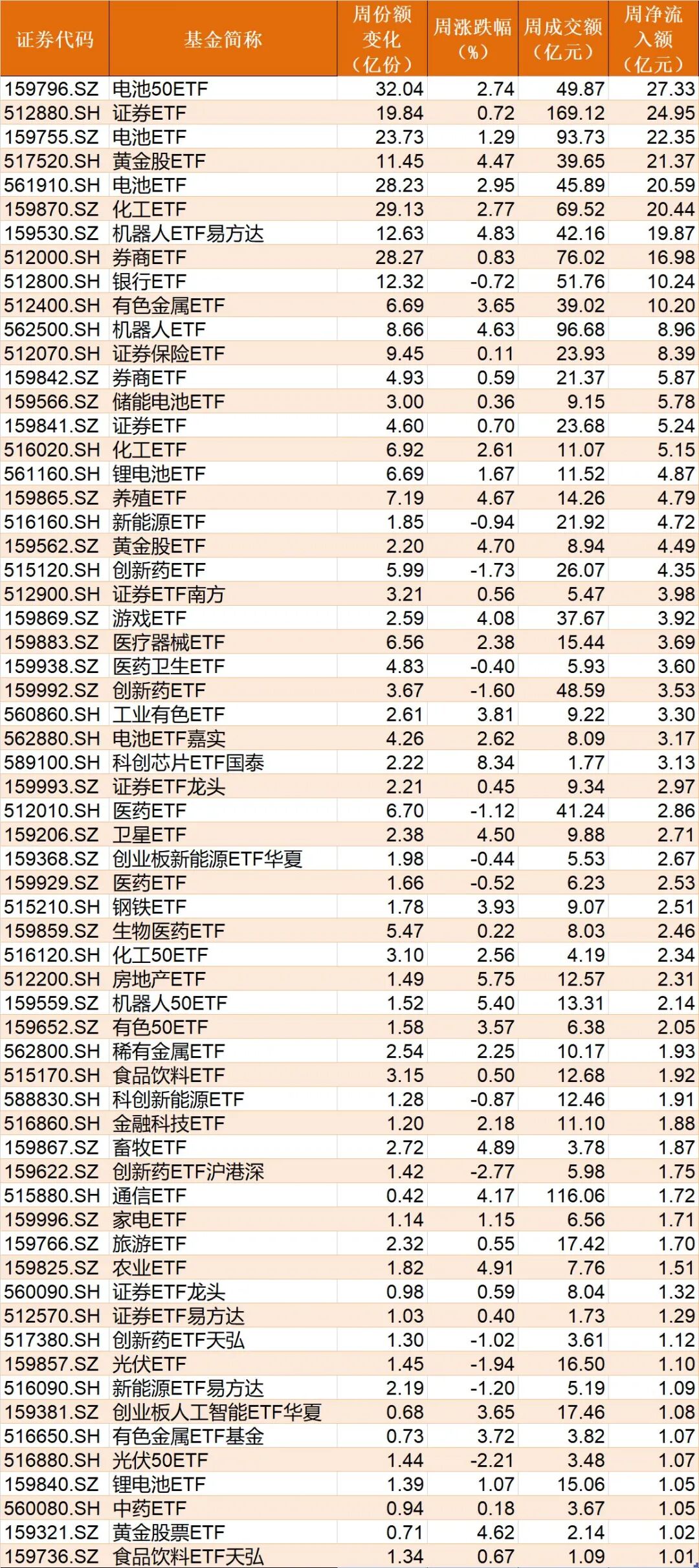 在行业主题ETF方面,本周净流入资金超1亿元的基金有62只,其中电池50ETF、证券ETF和电池ETF分别增加了32.04亿份、19.84亿份和23.73亿份,净流入资金27.33亿元、24.95亿元和22.35亿元。