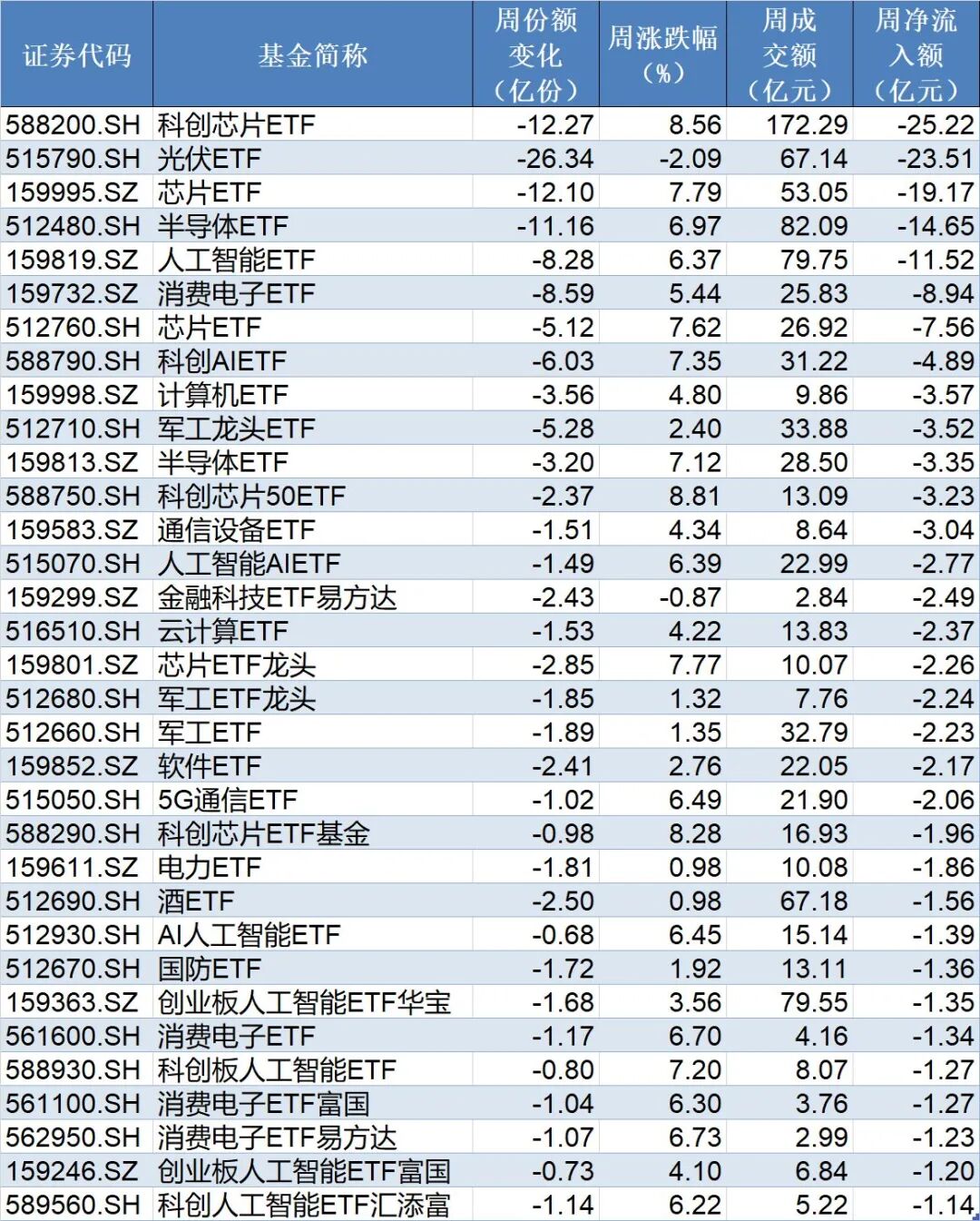 在资金流出方面,本周有33只行业主题ETF净流出逾1亿元,其中科创芯片ETF、光伏ETF和芯片ETF份额分别减少12.27亿份、26.34亿份和12.1亿份,分别净流出资金25.22亿元、23.51亿元和19.17亿元。