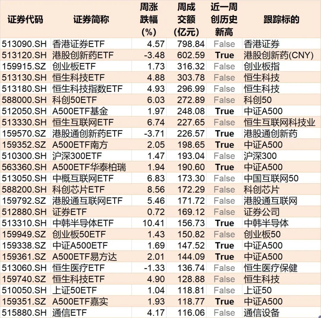 其中,香港证券ETF、港股创新药ETF周成交额超600亿元。