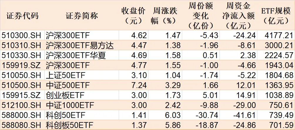 本周市场主要股指集体反弹,规模较大的ETF中,科创50ETF、科创板50ETF涨约6%。