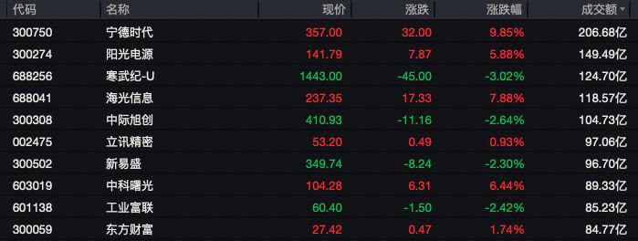 个股方面,宁德时代成交额超206亿元居首,阳光电源、寒武纪、海光信息、中际旭创成交额靠前。