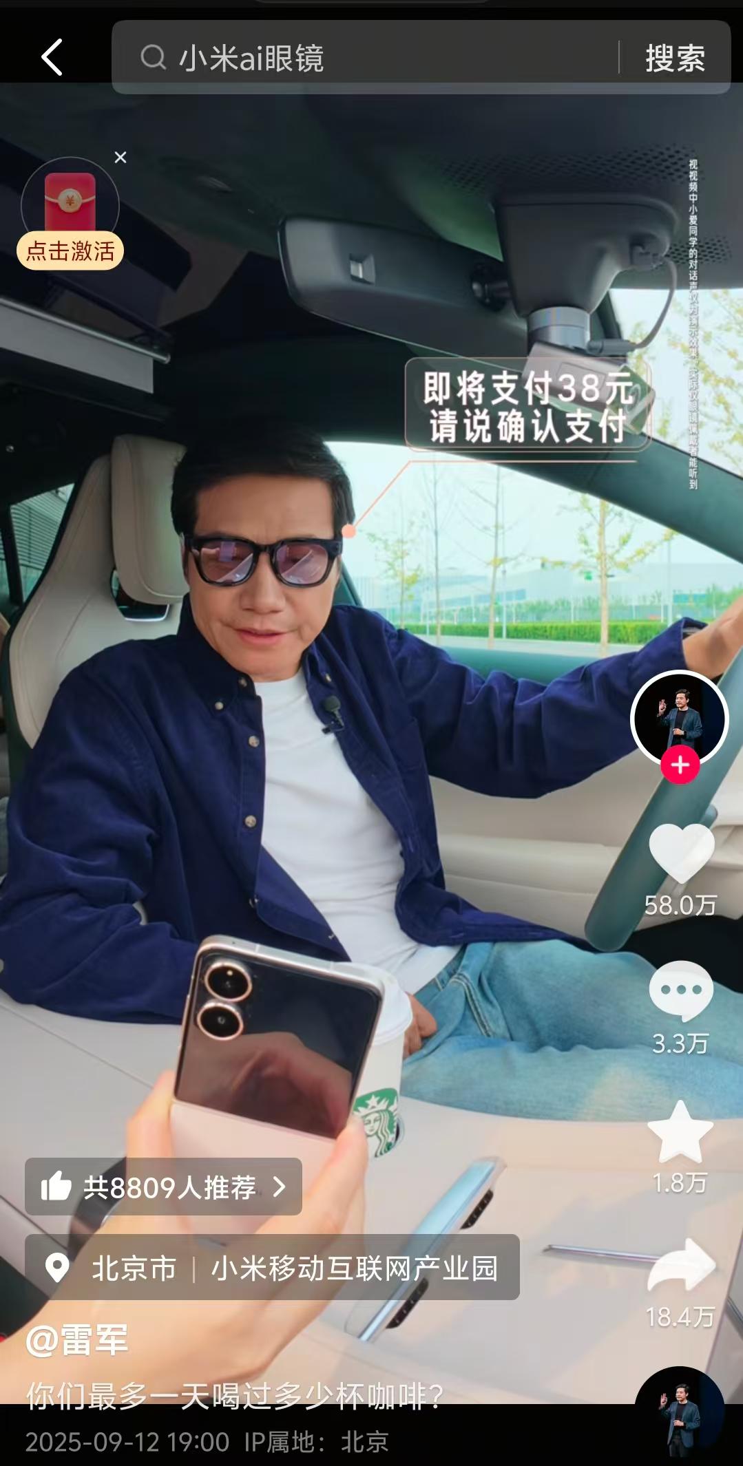 9月12日,小米集团(01810.HK)创始人雷军发布相关视频,在佩戴小米AI眼镜的情况下,他用声音发出指令向他人转款38元购买咖啡。