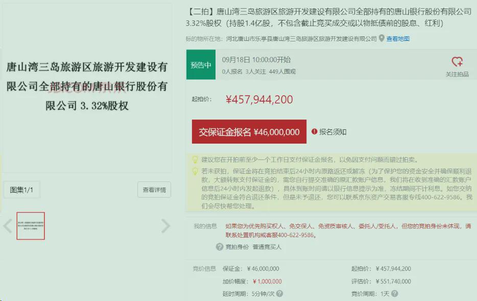 司法拍卖平台显示,唐山湾三岛旅游区旅游开发建设有限公司全部持有的唐山银行3.32%股权将于9月18日进行第二次拍卖,处置机构为唐山市中级人民法院。这笔股权共计1.4亿股,首次拍卖的起拍价为5.52亿元,流拍后第二次以4.58亿元起拍,降价0.94亿元,折合每股3.27元。