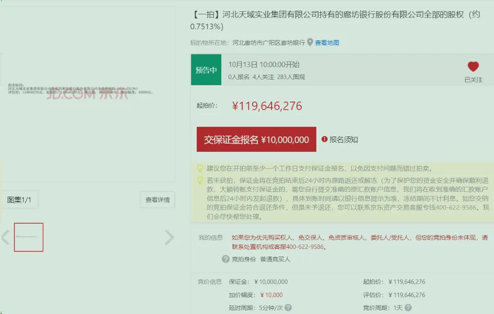 另一家股权被拍卖的是廊坊银行。司法拍卖平台显示,河北天域实业集团有限公司持有的廊坊银行全部股权将于10月13日公开拍卖,处置单位是廊坊市广阳区人民法院,这笔股权共计4335.01万股,占廊坊银行总股本约0.7513%,评估价为11964.63万元,折合每股2.76元,起拍价即为评估价。