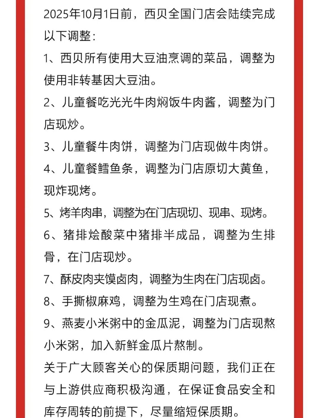 称10月1日之后门店将对预制菜进行整改,包括儿童餐牛肉酱改成门店现炒、猪排骨从半成品改成生排骨门店现炒、燕麦小米粥改成现熬等。