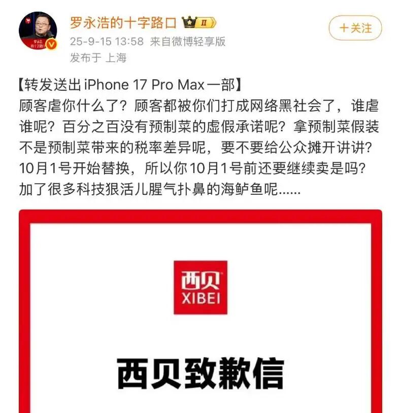 他在微博发起“转发送出iPhone17ProMax一部”的活动中质问:“顾客虐你什么了?顾客都被你们打成网络黑社会了,谁虐谁呢?百分之百没有预制菜的虚假承诺呢?”“10月1号前还要继续卖是吗?”