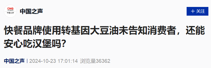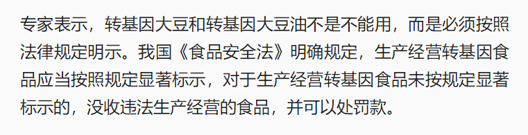 2024年10月23日,中国之声报道,天津市河西区市场监管执法人员对使用转基因大豆油但没有对消费者明示的快餐品牌进行了查处。报道援引专家观点表示,转基因大豆和转基因大豆油不是不能用,而是必须按照法律规定明示。