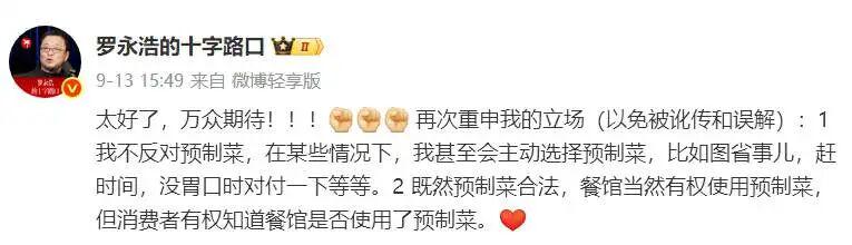 值得注意的是,本次网络口水战中,超过九成网友站在罗永浩一方。这甚至让罗永浩自己都感到不习惯。他也重申观点:不反对预制菜,但消费者必须拥有知情权。