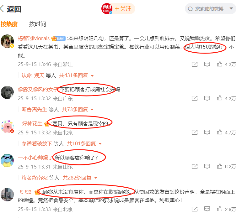 而在西贝致歉信微博下面,点赞量前五的评论条条精彩!比如“宝妈宝爸破防”“人均150的餐厅不能用预制菜”“所以,顾客虐你啥了?”“是你在欺骗顾客”。