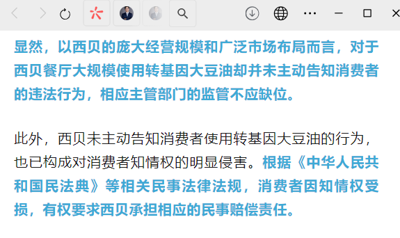 因此,有媒体认为,西贝未主动告知消费者使用转基因大豆油的行为,或已构成对消费者知情权的明显侵害。消费者有权要求西贝承担相应的民事赔偿责任。