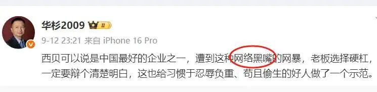 经溯源,深蓝财经发现,微博认证为“华与华营销咨询有限公司董事长华杉”的用户早在9月12日的博文中就使用了“网络黑嘴”一词,还支持西贝“干”“硬抗”到底。结合14日流出的贾国龙发言截图,“网络黑嘴”的说法很可能源自华杉。